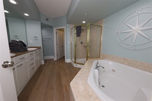 King Master Suite: Relax in the master bedroom with a king bed, a lavish ensuite bathroom featuring a jacuzzi tub and walk-in shower, and direct access to your own private oasis.
