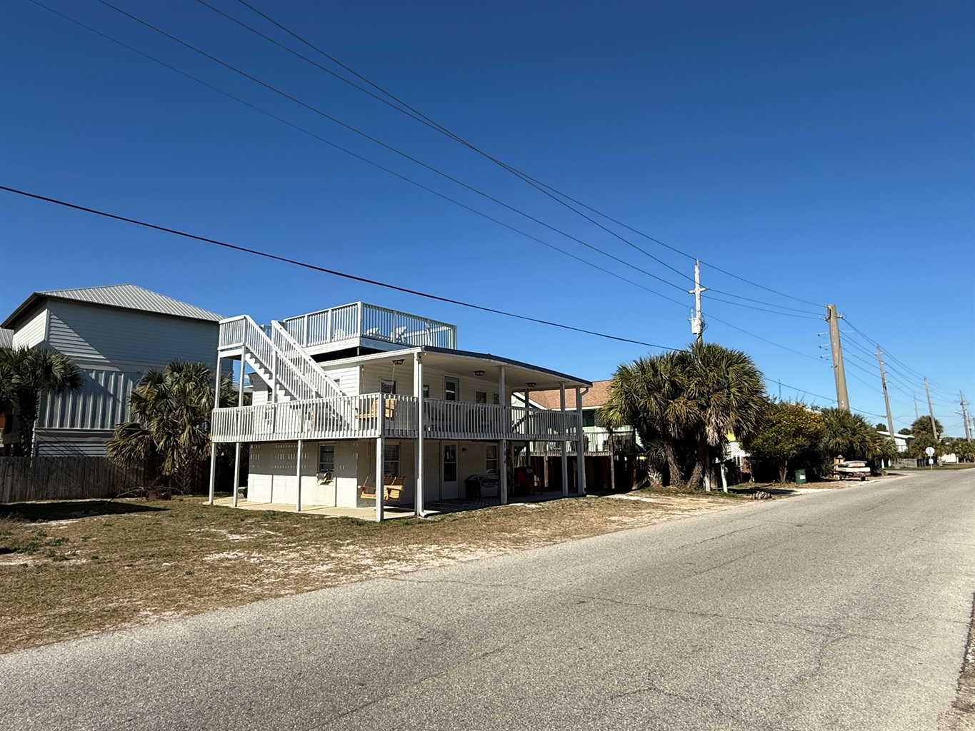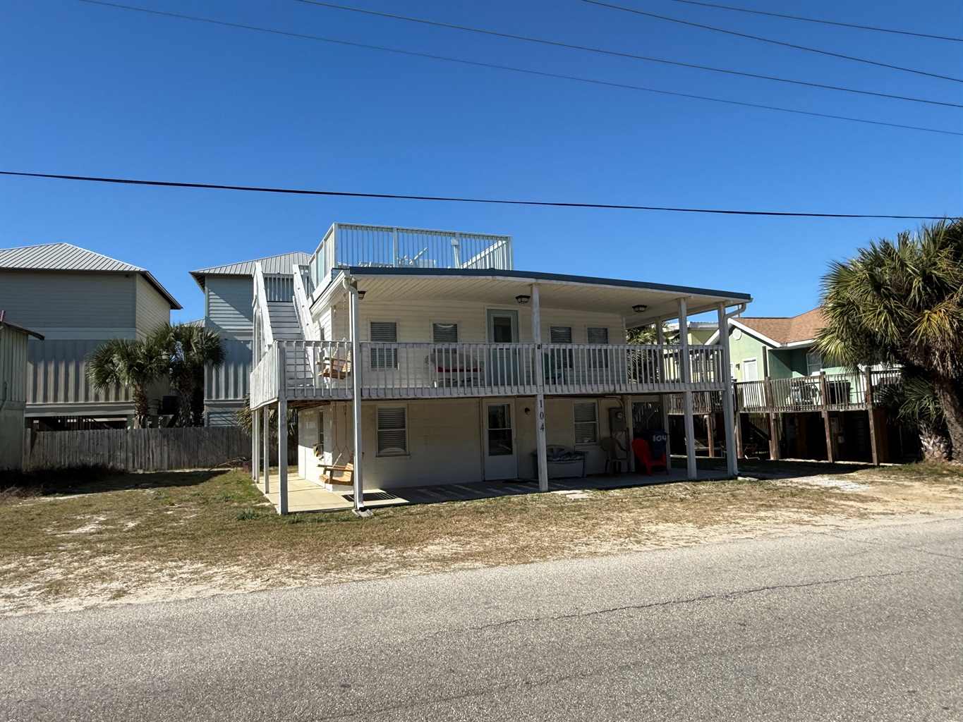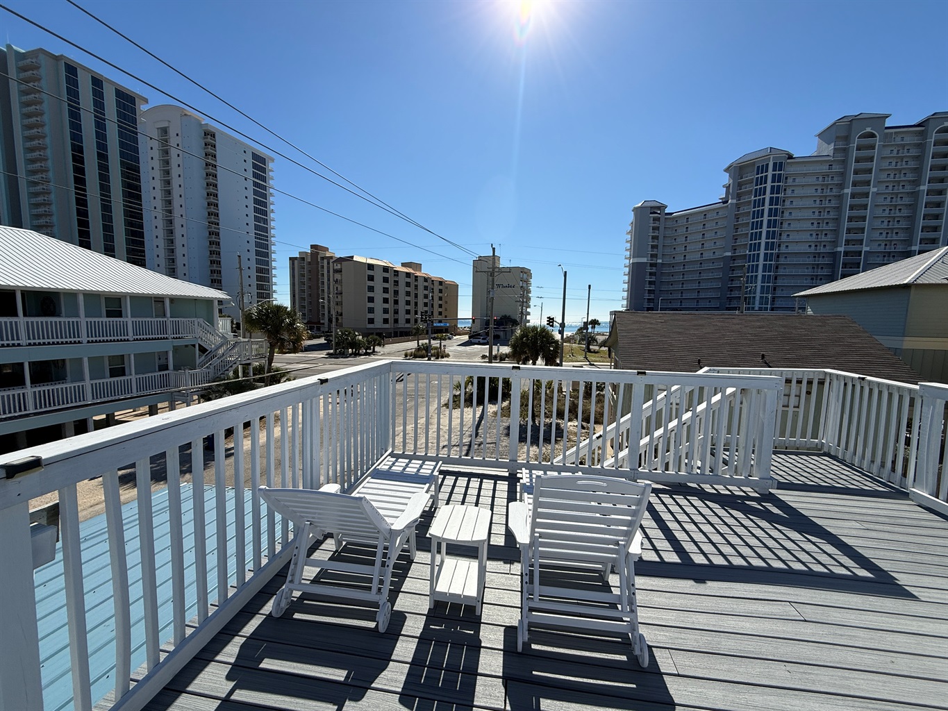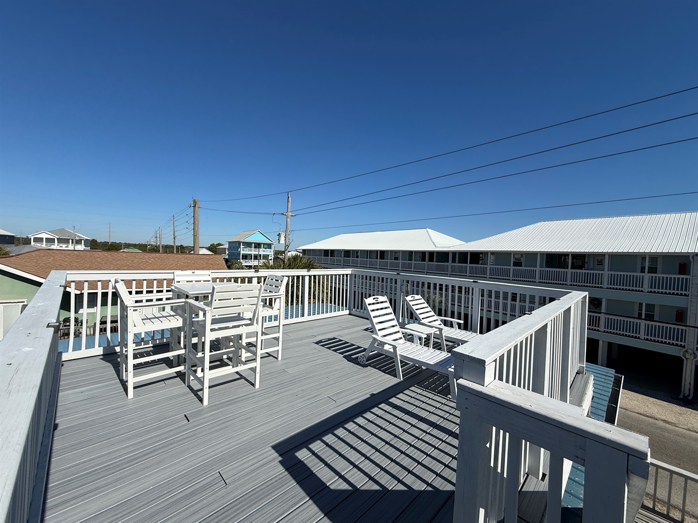 The highlight of the property is the shared rooftop observation deck. This deck is accessible to both the upstairs and downstairs units and features polywood seating and loungers. Enjoy elevated views of the Gulf shimmering between nearby condo buildings — a unique and memorable gathering space.