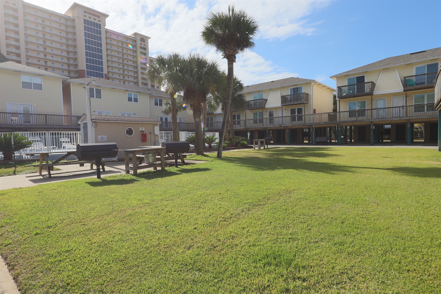 Central BBQ area with picnic tables—bring your grill masters!